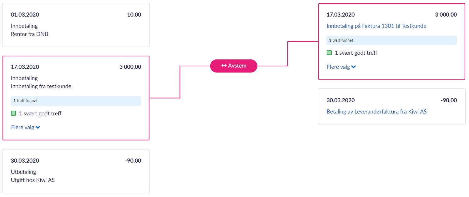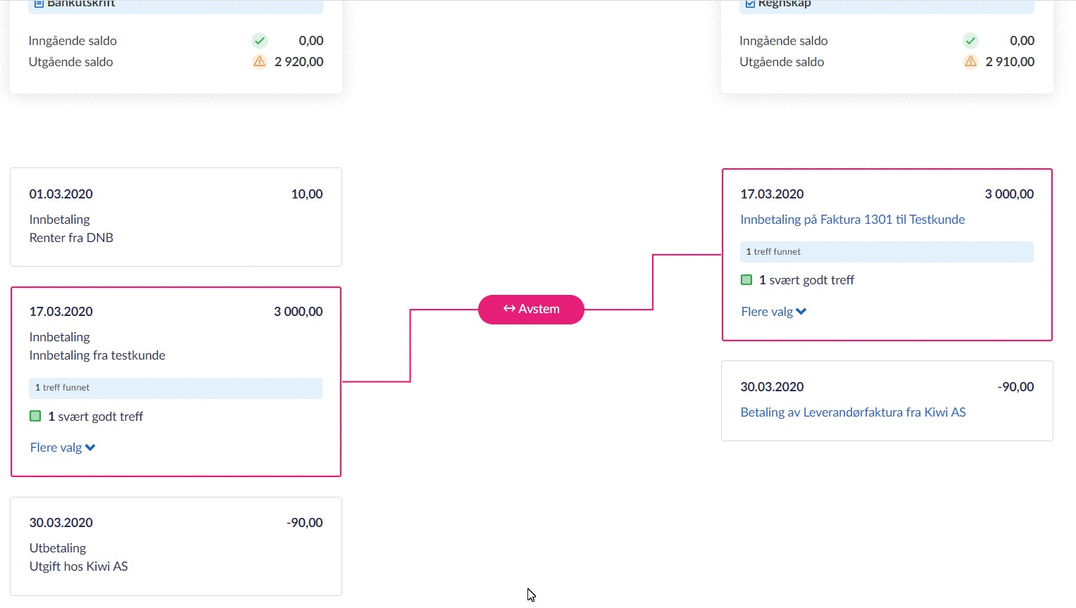Når du avstemmer en bankkonto så sjekker du at alle pengene som har gått inn og ut på bankkontoen, er også registrert i regnskapet. Det du avstemmer er alle transaksjoner (inn- og utbetalinger).