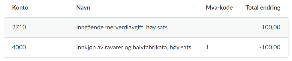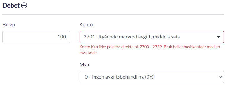 Hvis du forsøker å føre direkte mot konto 2700-2739 i manuelt bilag vil du få en feilmelding. Vi støtter ikke å føre direkte på mva-kontoer på denne måten fordi mva-koden ikke ville blitt med på føringen.