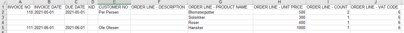 Du vil se at kolonnene A-J er fylt ut med ulike overskrifter. Alle disse er påkrevd å fylle ut, med unntak av kolonne D “KID” og kolonne F “Order line - description” som kan stå tomme.