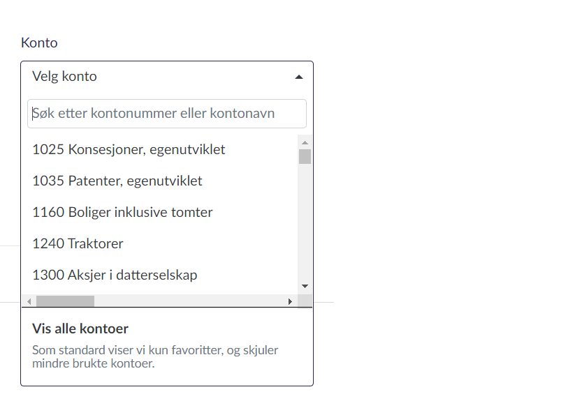 Når du skal velge hvilken konto du skal benytte vil vi som standard kun vise de kontoene som er markert som favoritter. Kontofavoritter er automatisk de kontoene du har brukt tidligere, bankkontoer, kunder og leverandører. Hvis du leter etter en konto du ikke har benyttet tidligere eller ikke allerede har markert som favoritt må du klikke “Vis alle kontoer”.