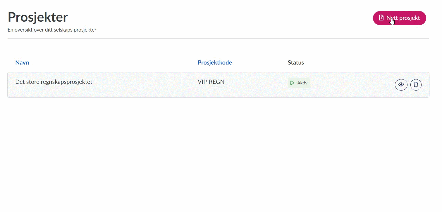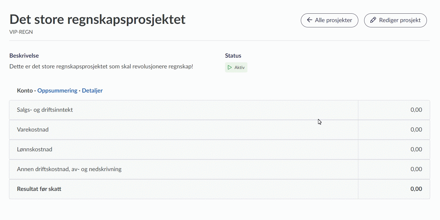 Hurra - nå er ditt første prosjekt opprettet! Du kan nå velge dette prosjektet på salg, utgifter og manuelle bilag.