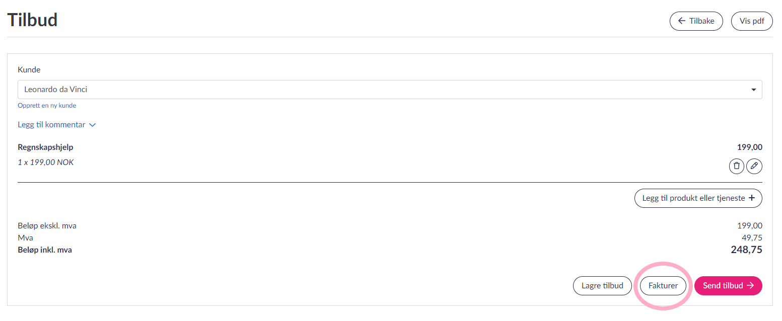 Du kan enkelt gjøre om et tilbud til en faktura ved å klikke på “Fakturer” på tilbudet