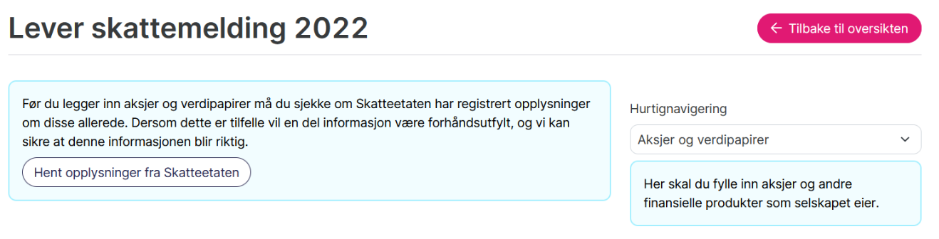 Dette er en av seksjonene som ikke vi kan fylle inn automatisk fra annen data i DigiTALL Regnskap, her må vi hente det fra Skatteetaten. Grunnen er at de har en referanse internt, og de vil at skattemeldingen skal leveres med den samme referansen.