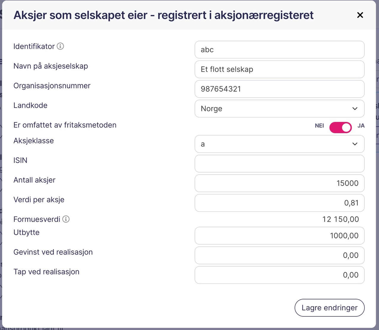 I seksjonen Aksjer og verdipapirer skal man fylle inn informasjon om aksjene og verdipapirene som selskapet eier.
